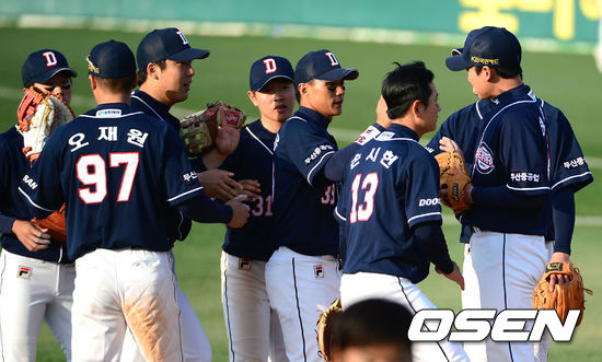 경기 종료 후 두산 선수들이 승리의 기쁨을 나누고 있다. /sunday@osen.co.kr