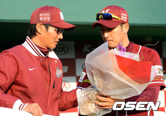 경기종료 후 첫 승을 거둔 넥센 염경엽 감독가 주장 이택근에게 꽃다발 선물을 받고 있다/ soul1014@osen.co.kr