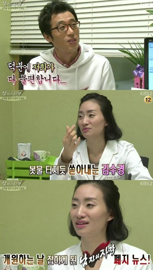 또한 김수경 씨는 “개원하는 날 ‘남격’의 폐지 소식을 듣게 됐다. 남편 수입이야 늘 그래서 상관은 없다”며 “4년 전에는 스케줄이 하나였다. 그 때도 살았다”고 말해 웃음을 자아냈다.