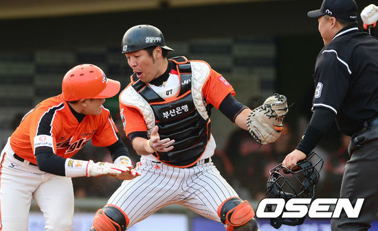 31일 오후 부산 사직구장에서 열린 '2013 한국야쿠르트 세븐 프로야구' 롯데 자이언츠와 한화 이글스의 경기 9회초 2사 1,2루 김태균의 1타점 적시타 상황, 2루주자 이대수가 홈에서 세이프되자 강민호가 주심에게 항의하고 있다.