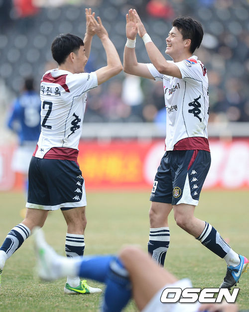 경기 종료 후 승리를 거둔 대전 박진옥과 정석민이 기뻐하고 있다. / youngrae@osen.co.kr