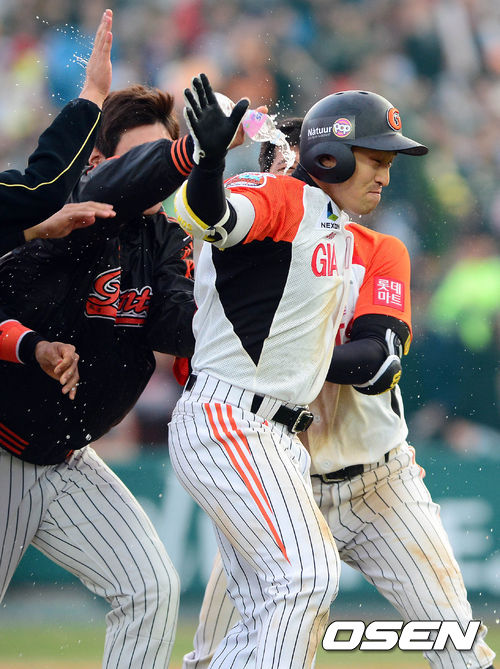 31일 오후 부산 사직구장에서 열린 '2013 한국야쿠르트 세븐 프로야구' 롯데 자이언츠와 한화 이글스의 경기 종료 후 손아섭이 동료들과 승리의 기쁨을 나누고 있다.