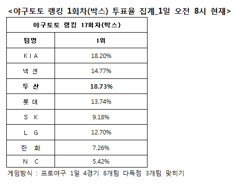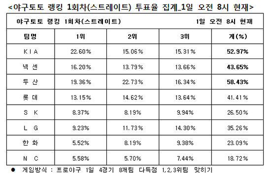 스포츠토토 공식발매사이트인 베트맨(www.betman.co.kr)은 2일 개최되는 두산-SK, 넥센-LG, 한화-KIA, NC-롯데 등 4경기 8개팀을 대상으로 한 야구토토 랭킹 1회차 스트레이트 게임 중간집계결과 두산(58.43%), KIA(52.97%), 넥센(43.65%)을 차례로 다득점 상위 3개팀으로 꼽았다고 밝혔다. 반면 한화와 NC은 각각 23.09%와 18.72%를 득표해 가장 적은 득점을 기록할 것으로 예상했다.
