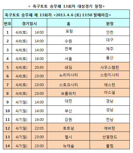 국민체육진흥공단(www.kspo.or.kr)이 발행하는 체육진흥투표권 수탁사업자인 스포츠토토(www.sportstoto.co.kr)는 오는 6일부터 7일까지 벌어지는 K리그 클래식 7경기 및 잉글랜드 프리미어리그(EPL) 7경기 등 총 14경기를 대상으로 한 축구토토 승무패 13회차 게임을 발행한다고 밝혔다.