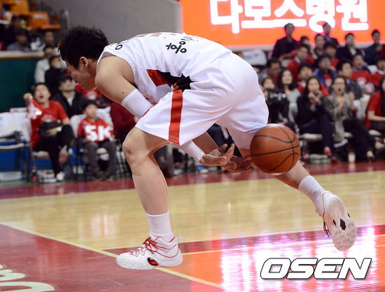 1일 오후 서울 잠실학생체육관에서 열린 'KB 국민카드 2012-2013 프로농구' 4강 플레이오프 1차전 서울 SK와 안양 KGC의 경기 1쿼터 KGC 이정현이 몸을 날려 공을 살려내고 있다.