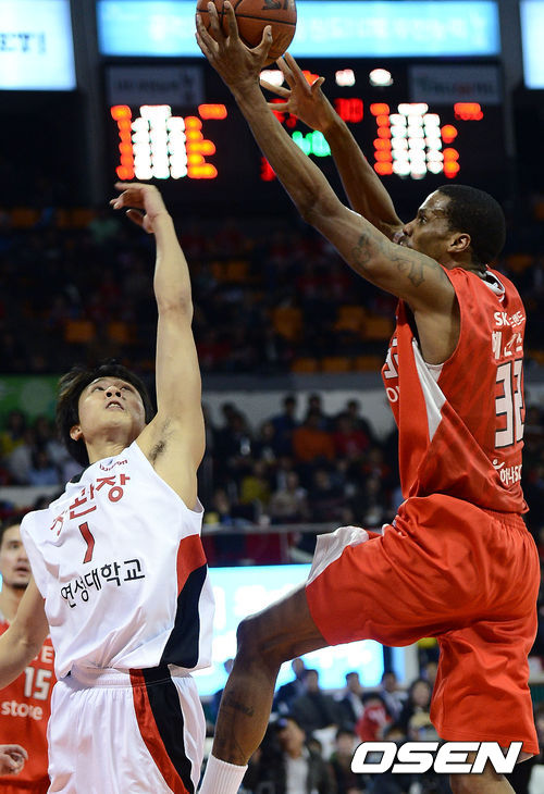 1일 오후 서울 잠실학생체육관에서 열린 'KB 국민카드 2012-2013 프로농구' 4강 플레이오프 1차전 서울 SK와 안양 KGC의 경기 2쿼터 SK 헤인즈가 KGC 김태술을 앞에두고 레이업슛을 시도하고 있다.