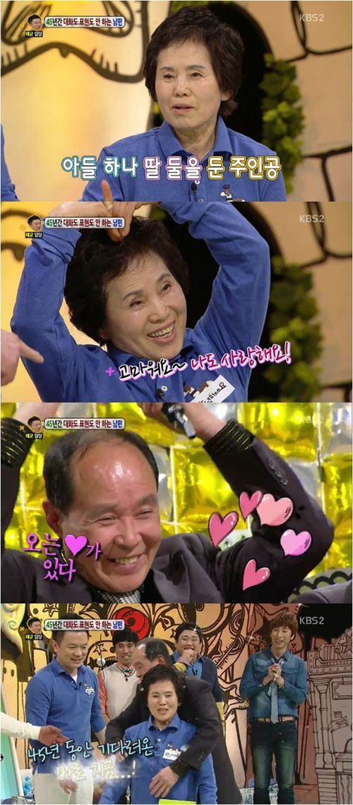 결혼생활 45년간 남편에게 사랑한다는 고백을 듣지 못한 할머니가 ‘안녕하세요’에 출연했다. 그리고 할머니는 방송을 통해 남편에게 처음으로 사랑한다는 애정표현을 받았다.