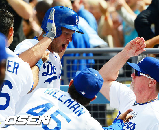 8회말 다저스의 선두타자 커쇼가 솔로 홈런을 날린 후 덕아웃에서 동료들과 기쁨을 나누고 있다./ rumi@osen.co.kr