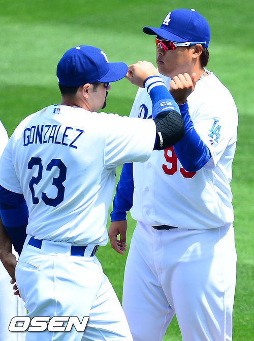 경기 전 개막식에서 류현진이 4번타자 애드리안 곤살레스와 하이파이브를 하고 있다./ rumi@osen.co.kr