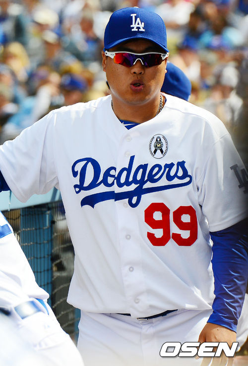 8회말 다저스의 선두타자 커쇼가 솔로 홈런을 날린 후 덕아웃에서 휴식을 취할때 류현진이 커쇼를 바라보며 놀란 표정을 짓고 있다. / rumi@osen.co.kr