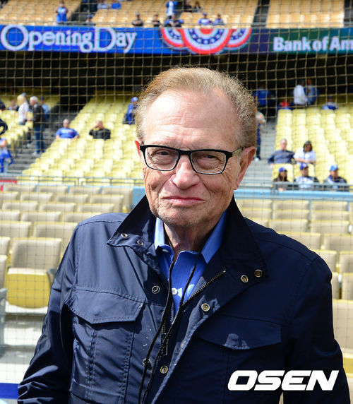 경기 전 토크쇼 진행자 래리 킹이 취재진의 카메라를 보며 미소짓고 있다. / rumi@osen.co.kr