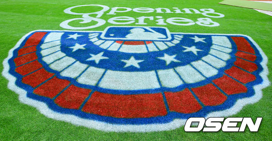 다저스타디움 그라운드에 개막전을 알리는 그림이 그려져 있다.. / rumi@osen.co.kr
