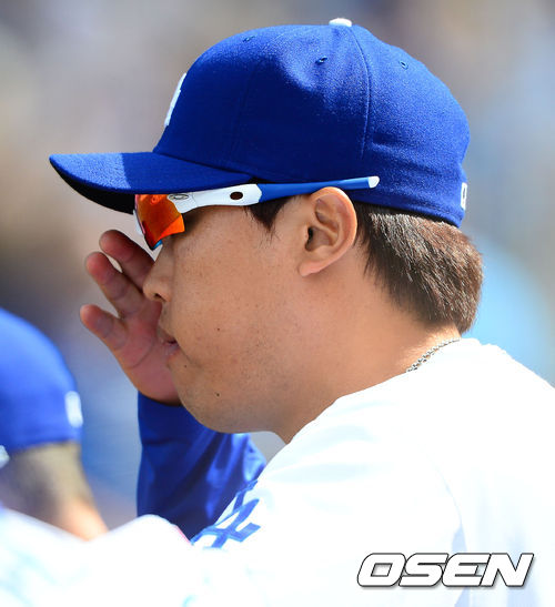 LA 다저스 류현진이 경기를 지켜보며 눈을 만지고 있다. / rumi@osen.co.kr