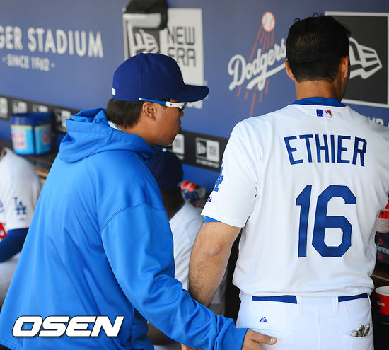 LA 다저스 류현진이 안드레 이디어의 엉덩이를 치고 있다. / rumi@osen.co.kr