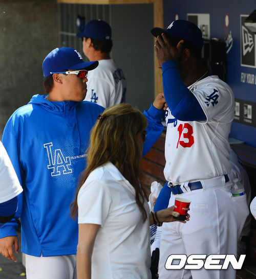 LA 다저스 류현진이 핸리 라미레스와 즐겁게 얘기를 나누고 있다. / rumi@osen.co.kr