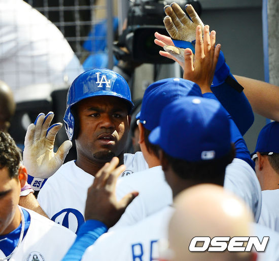 8회 무사 1,3루 LA다저스 메캠프 타석에서 샌프란시스코 산티아고 카실라의 와일드 피칭때 칼 크로포드가 홈으로 몸을 날리며 세이프한 후 덕아웃에서 동료들과 기쁨을 나누고 있다. / rumi@osen.co.kr