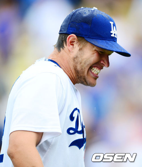 경기를 마치고 커쇼가 인터뷰 중 축하 얼음세례를 당한 후 차가워 하고 있다. / rumi@osen.co.kr