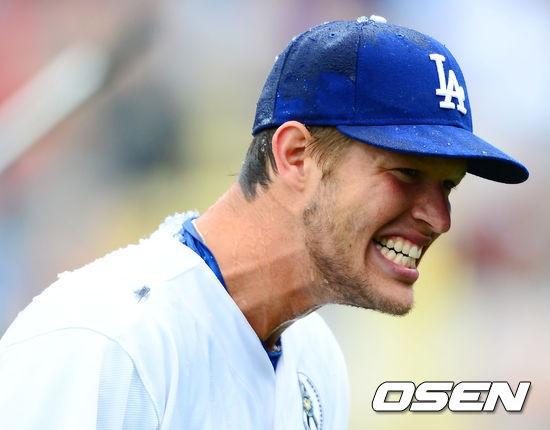 경기를 마치고 커쇼가 인터뷰 중 축하 얼음세례를 당한 후 차가워 하고 있다. / rumi@osen.co.kr