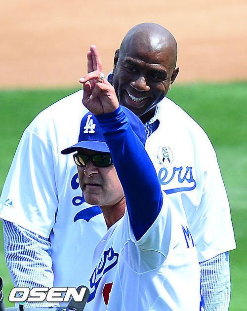 시구를 위해 나온 전설의 농구 선수 매직 존슨을 LA 다저스 돈 매팅리 감독이 교체하고 있다. / rumi@oen.co.kr