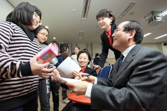 KT에서 은퇴한 이덕신 씨(59)가 ‘꿈을 이루는 경제이야기’라는 주제로 서울 잠일초등학교에서 교육 후 아이들에게 사인을 해주고 있다. /KT 제공.