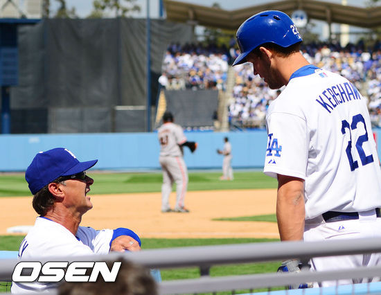 타격을 준비하는 클레이튼 커쇼와 돈 매팅리 감독이 얘기를 나누고 있다. / rumi@oen.co.kr
