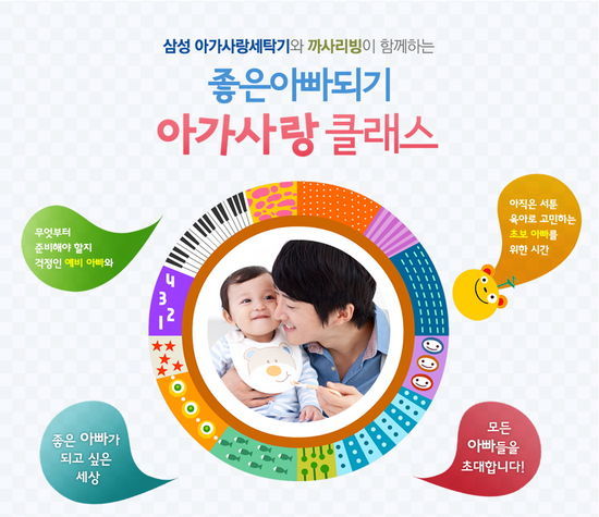 삼성전자 관계자는 “육아는 부모가 함께 고민하고 분담해야 하지만, 아빠들이 무턱대고 육아에 뛰어 들었다간 실수를 연발하거나 쉽게 지칠 수 있으므로 적절한 ‘아빠 교육’이 필요하다”며, “스마트한 아빠로 거듭나기 위해 삼성 아가사랑세탁기가 마련한 이번 육아 클래스에 많은 관심 부탁 드린다”고 전했다.