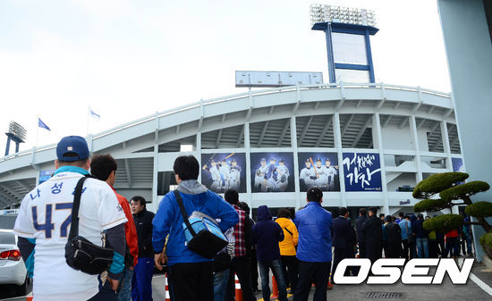 2일 오후 창원 마산구장에서 열리는 '2013 한국야쿠르트 세븐 프로야구' NC 다이노스와 롯데 자이언츠의 경기 시작 전 야구 팬들이 표를 구하기 위해 매표소에 줄을 서 있다.