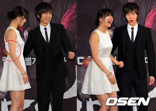 2일 오후 서울 여의도 63빌딩에서 진행된 MBC 새 월화드라마 '구가의 서' 제작발표회에서 배우 배수지와 이승기가 서로의 과감한 스킨쉽에 놀라고 있다