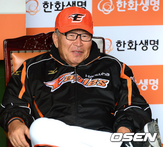 경기에 앞서 한화 김응룡 감독이 덕아웃에서 취재진과 이야기를 나누고 있다.