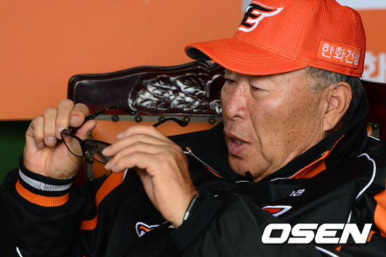 경기에 앞서 한화 김응룡 감독이 덕아웃에서 취재진과 이야기를 나누고 있다.