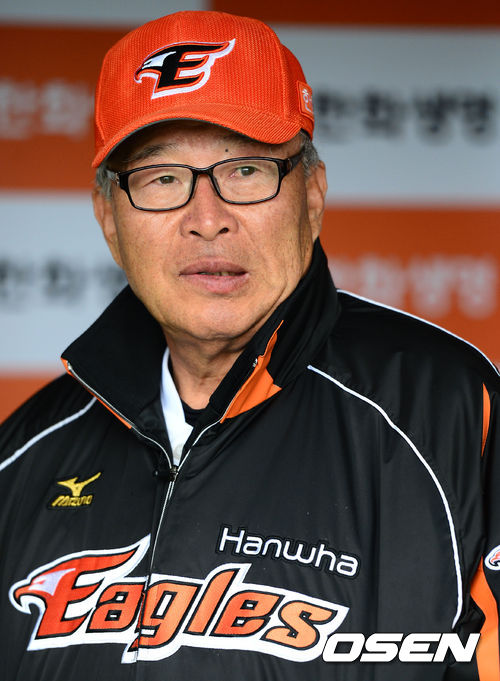 경기에 앞서 한화 김응룡 감독이 덕아웃에서 취재진과 이야기를 나누고 있다.