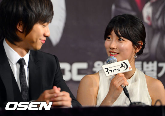 2일 오후 서울 여의도 63빌딩에서 진행된 MBC 새 월화드라마 '구가의 서' 제작발표회에서 배우 배수지가 이승기와 이야기를 나누고 있다.