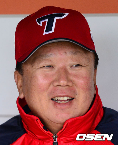 경기에 앞서 KIA 선동렬 감독이 덕아웃에서 취재진과 이야기를 나누며 미소를 짓고 있다.