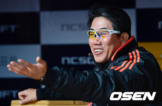 2일 오후 창원 마산구장에서 열리는 '2013 한국야쿠르트 세븐 프로야구' NC 다이노스와 롯데 자이언츠의 경기 시작 전 김시진 감독이 덕아웃에서 취재진들과 이야기를 나누고 있다.