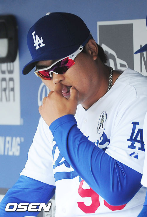 덕아웃에서 류현진이 손톱을 물어뜯고 있다. / rumi@oen.co.kr