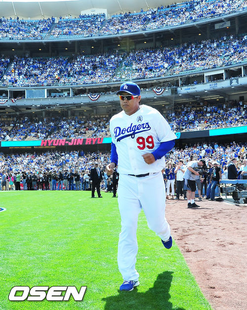 개막식 오프닝에 LA 다저스 류현진이 그라운드로 입장하고 있다. / rumi@oen.co.kr