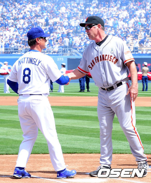 LA 다저스 돈 매팅리 감독과 샌프란시스코 자이언츠 브루스 보치 감독이 경기 전 악수를 나누고 있다. / rumi@oen.co.kr