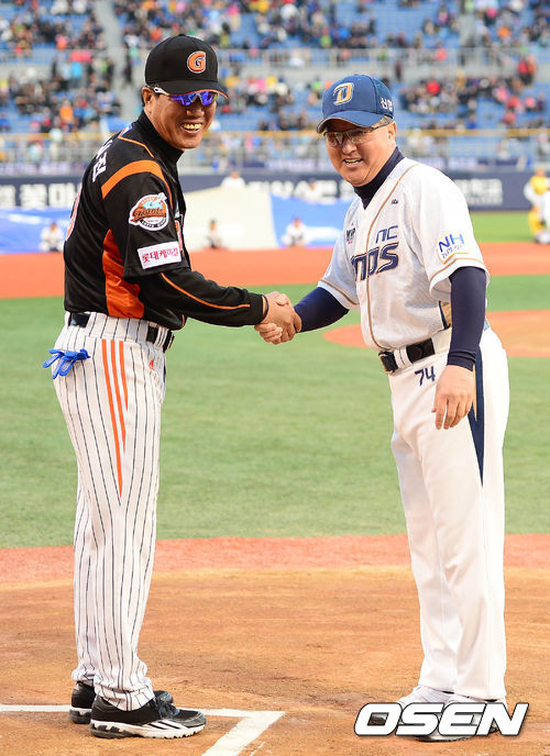 2일 오후 창원 마산구장에서 열린 '2013 한국야쿠르트 세븐 프로야구' NC 다이노스와 롯데 자이언츠의 경기 시작 전 김시진 감독과 김경문 감독이 악수를 나누고 있다.