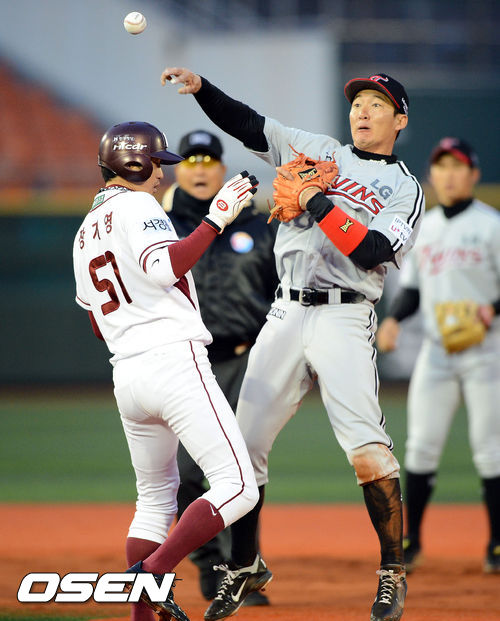 [OSEN=목동,박준형 기자 2일 오후 서울 목동구장에서 열린 '2013 한국야쿠르트 세븐 프로야구' 넥센 히어로즈와 LG 트윈스의 경기 1회말 무사 1루 넥센 서건창의 내야땅볼때 LG 손주인이 1루 주자 장기영과 충돌한 후 1루 송구하고 있다. 그사이 서건창을 세이프.