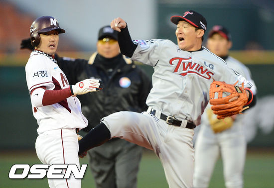 [OSEN=목동,박준형 기자 2일 오후 서울 목동구장에서 열린 '2013 한국야쿠르트 세븐 프로야구' 넥센 히어로즈와 LG 트윈스의 경기 1회말 무사 1루 넥센 서건창의 내야땅볼때 LG 손주인이 1루 주자 장기영과 충돌한 후 1루 송구하고 있다. 그사이 서건창을 세이프.