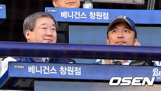 2일 오후 창원 마산구장에서 열린 '2013 한국야쿠르트 세븐 프로야구' NC 다이노스와 롯데 자이언츠의 경기 시작 전, 구본능 총재와 김택진 NC 구단주가 관중석에 앉아 있다.