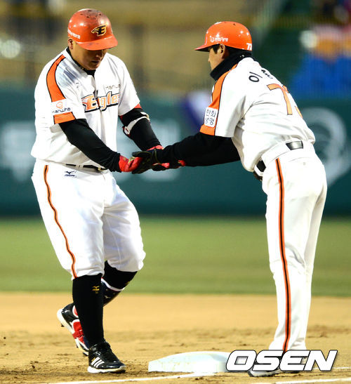 1회말 1사 1,3루에서 한화 김태균이 좌전 적시타를 치고 이종범 코치와 하이파이브를 하고 있다.