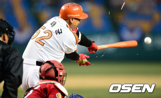1회말 1사 1,3루에서 한화 김태균이 좌전 적시타를 치고 있다.
