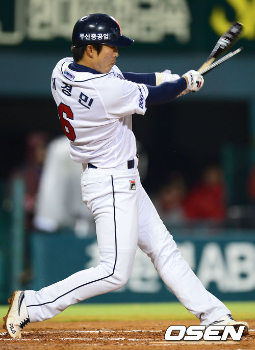 2일 오후 서울 잠실야구장에서 '2013 한국야쿠르트 세븐프로야구' 두산 베어스 대 SK 와이번스의 경기가 열렸다. 2회말 두산 공격 무사 1루 상황 7번 허경민이 2루타를 날리고 있다.