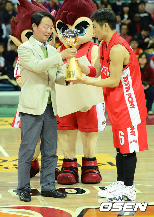 2일 오후 울산 동천체육관에서 열린 'KB 국민카드 2012-2013 프로농구' 4강 플레이오프 1차전 울산 모비스와 인천 전자랜드의 경기에 앞서 정규리그 2위를 차지한 모비스를 대표해 양동근이 KBL 한성교 총재로부터 정규리그 2위 트로피를 건네받고 있다.
