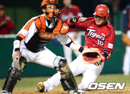 3회초 2사 1,2루에서 KIA 김주찬이 우전 3루타를 치고 우익수 실책으로 홈으로 쇄도해 세이프 되고 있다.