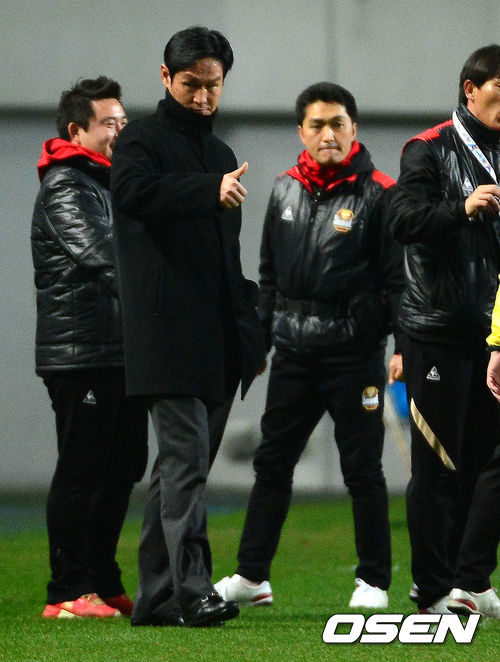 전반 서울 에스쿠데로가 선제골을 성공시키자 최용구 감독이 엄지손가락을 치켜들며 격려하고 있다.