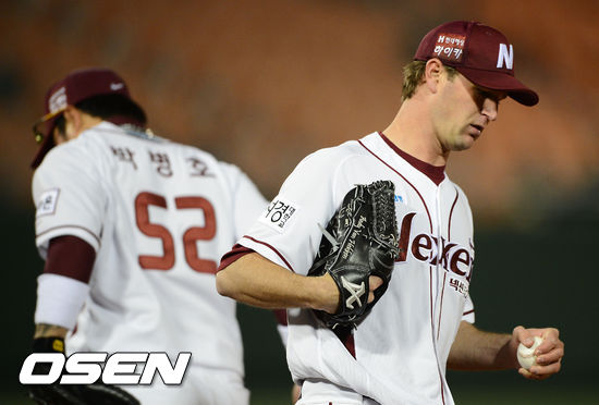 2일 오후 서울 목동구장에서 열린 '2013 한국야쿠르트 세븐 프로야구' 넥센 히어로즈와 LG 트윈스의 경기 3회초 1사 LG 이진영의 내야땅볼을 넥센 선발투수 밴 헤켄이 직접 1루 포스아웃하고 있다.