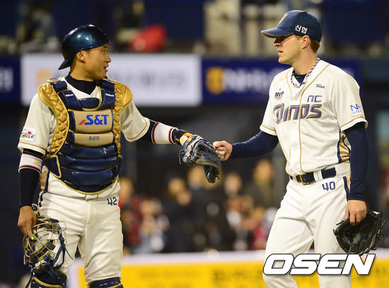 2일 오후 창원 마산구장에서 열린 '2013 한국야쿠르트 세븐 프로야구' NC 다이노스와 롯데 자이언츠의 경기 5회초를 마친 아담이 덕아웃으로 향하며 김태군과 하이파이브를 하고 있다.