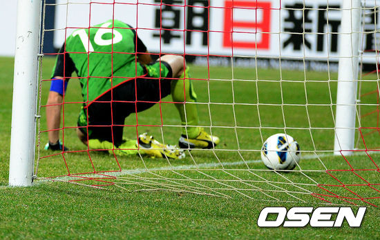 전반 서울 김진규의 프리킥골을 센다이 하야시 다쿠토 골키퍼가 다리 사이로 빠뜨리며 실점을 허용하고 있다.